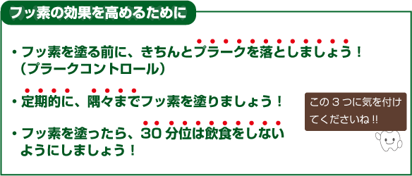 フッ素は確かにむし歯になりにくい状態をつくりますが、それによって、完全にむし歯が予防できるものではありません。あくまでもむし歯予防の基本は毎日の歯みがき。このブラッシング(歯みがき)とともにフッ素を併用することではじめて、高い予防効果を発揮します。もちろん、一度むし歯になってしまったら、フッ素を使っても治りませんよ!