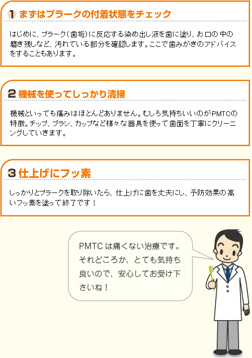 PMTCとはProfessional Mechanical Tooth Cleaning の略です。簡単にいうと、「歯科医師や歯科衛生士による、専用の機器を使った歯のお掃除」という意味になります。専門的なクリーニングですので、歯ブラシでは取れない汚れまで、しっかりと落とすことができ、何よりとても気持ちの良い施術です。なお、歯石をきれいに取り除いた後に行います。(PMTCでは歯石は取れません)