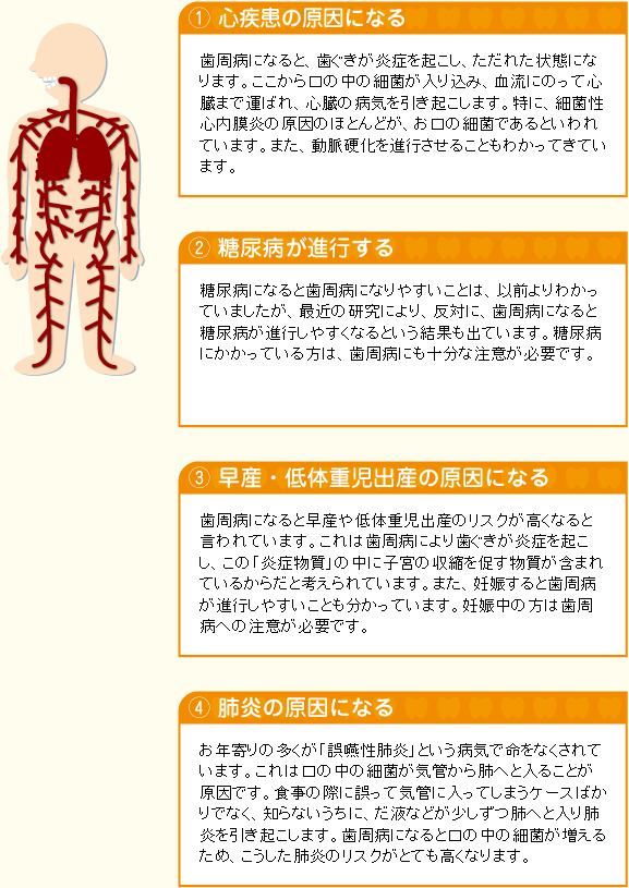 歯周病は細菌が引き起こす歯ぐきの病気。その細菌の数は1ミリグラム(1グラムの1000分の1)のプラークの中に10億以上いるといわれています。この細菌はお口の中だけでなく、血管、気管などを経由して身体全体に影響を及ぼします。